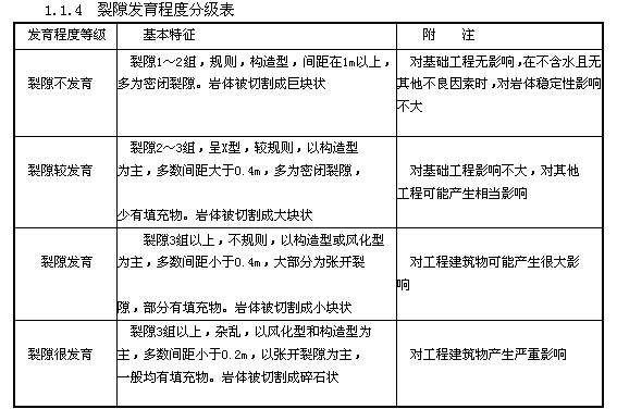 ?、倭严?。裂隙也稱為節(jié)理,是存在于巖體中的裂縫,是巖體受力斷裂后兩側(cè)巖塊沒有顯著位移的小型斷裂構造。在數(shù)值上一般用裂隙率表示,即巖石中裂隙的面積與巖石總面積的百分比,裂隙率越大,表示巖石中的裂隙越發(fā)育;反之,則表示裂隙不發(fā)育。在表1.1.4中介紹了公路工程對裂隙發(fā)育程度劃分的等級及對工程的影響。