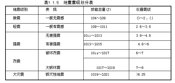 地震是依據(jù)地震釋放出來的能量多少來劃分震級的,釋放出來的能量越多,震級就越大。中國科學院將地震震級分為五級:微震、輕震、強震、烈震和大災震。地震釋放的能量與儀器測定的震級劃分見表1.1.5。