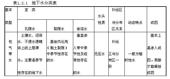 根據(jù)埋藏條件,將地下水分為包氣帶水、潛水、承壓水三大類。根據(jù)含水層的空隙性質(zhì),地下水又分為孔隙水、裂隙水和巖溶水三個亞類。根據(jù)上述分類原則,將地下水的基本類型列于表1.2.10