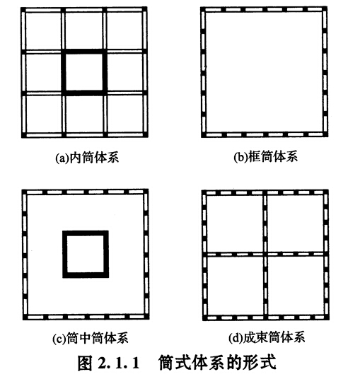 (5)筒體結(jié)構(gòu)體系。在高層建筑中,特別是超高層建筑中,水平荷載愈來(lái)愈大,起著控制作用,簡(jiǎn)體結(jié)構(gòu)是抵抗水平荷載最有效的結(jié)構(gòu)體系。它的受力特點(diǎn)是,整個(gè)建筑猶如一個(gè)固定于基礎(chǔ)上的封閉空心的筒式懸臂梁來(lái)抵抗水平力。筒體結(jié)構(gòu)可分為框架一核心筒結(jié)構(gòu)、筒中筒和多筒結(jié)構(gòu)等,見(jiàn)圖2.1.10框筒結(jié)構(gòu)一般在中央布置剪力墻薄壁筒,承受大部分水平力,周邊布置大柱距的稀柱框架,其受力特點(diǎn)類(lèi)似于框架一剪力墻結(jié)構(gòu),也有把多個(gè)筒體布置在結(jié)構(gòu)的端部,中部為框架的框筒結(jié)構(gòu)。筒中筒結(jié)構(gòu)的內(nèi)筒一般由電梯間、樓梯間組成。內(nèi)筒與外筒由樓蓋連接成整體,共同抵抗水平荷載及豎向荷載。這種結(jié)構(gòu)體系適用于30 ---50層的房屋。多筒結(jié)構(gòu)是將多個(gè)筒組合在一起,使結(jié)構(gòu)具有更大的抵抗水平荷載的能力。