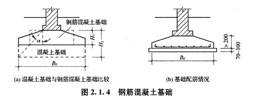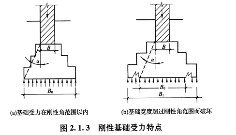 1)剛性基礎(chǔ)。剛性基礎(chǔ)所用的材料如磚、石、混凝土等,抗壓強(qiáng)度較高,但抗拉及抗剪強(qiáng)度偏低。用此類(lèi)材料建造的基礎(chǔ),應(yīng)保證其基底只受壓,不受拉。由于受地耐力的影響,基底應(yīng)比基頂墻(柱)寬些。根據(jù)材料受力的特點(diǎn),不同材料構(gòu)成的基礎(chǔ),其傳遞壓力的角度也不相同。剛性基礎(chǔ)中壓力分角口稱(chēng)為剛性角.o在設(shè)計(jì)中,應(yīng)盡力使基礎(chǔ)大放腳與基礎(chǔ)材料的剛性角相一致,以確?;A(chǔ)底面不產(chǎn)生拉應(yīng)力,最大限度地節(jié)約基礎(chǔ)材料。受剛性角限制的基礎(chǔ)稱(chēng)為剛性基礎(chǔ),構(gòu)造上通過(guò)限制剛性基礎(chǔ)寬高比來(lái)滿(mǎn)足剛性角的要求,如圖2.1.30