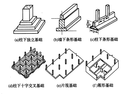基礎(chǔ)按受力特點(diǎn)及材料性能可分為剛性基礎(chǔ)和柔性基礎(chǔ);按構(gòu)造的方式可分為條形基礎(chǔ)、獨(dú)立基礎(chǔ)、片筏基礎(chǔ)、箱形基礎(chǔ)、樁基礎(chǔ)等。