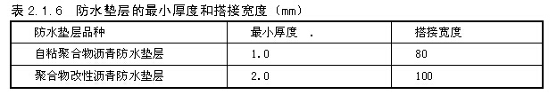 層。防水墊層宜采用自粘聚合物瀝青防水墊層、聚合物改性瀝青防水墊層,其最小厚度和