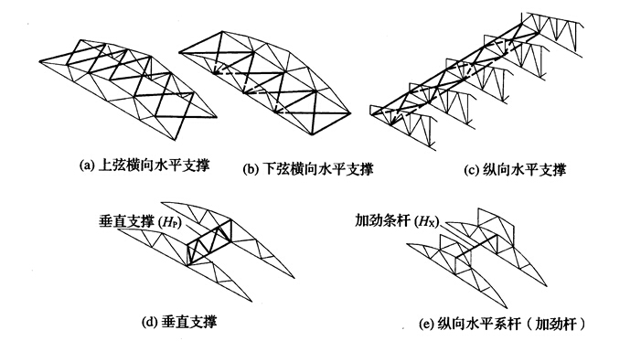支撐、下弦垂直支撐及水平系桿、縱向支撐、天窗架垂直支撐、‘天窗架上弦橫向支撐等。
