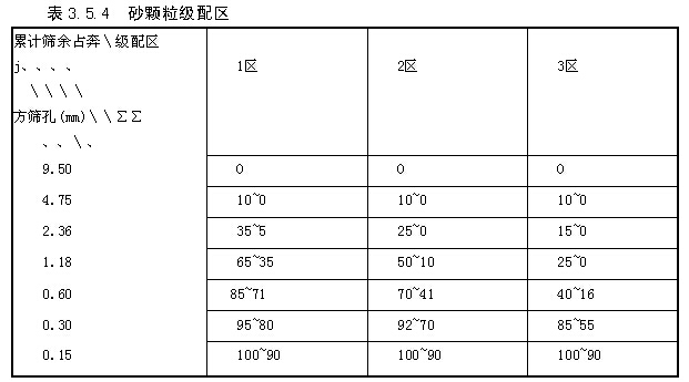 砂的顆粒級配用級配區(qū)表示,根據(jù)《建筑用砂》GB/T 14684的規(guī)定,對細(xì)度模數(shù)為3.7~1.6的砂,按累計(jì)篩余百分率劃分為三個級配區(qū),見表3.5.40混凝土用砂的顆粒級配應(yīng)處于表3.5.4中的任何一個級配區(qū)內(nèi),表中所列的累計(jì)篩余百分率,除4.75mm和0.60mm篩號外,允許稍有超出分界線,其總量不大于5%。