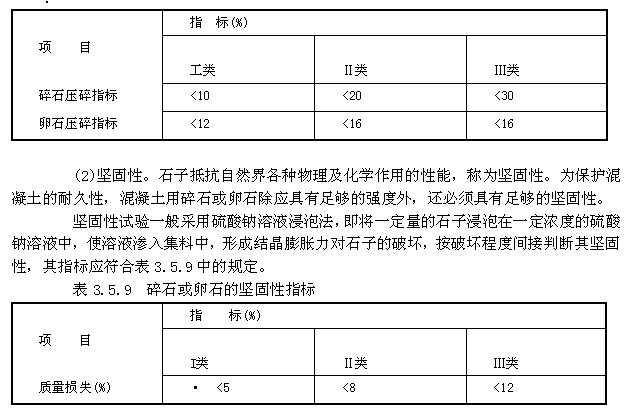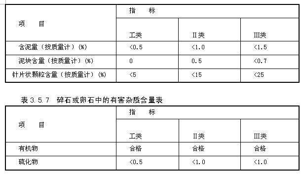 石子中含有黏土、淤泥、有機(jī)物、硫化物及硫酸鹽和其他活性氧化硅等雜質(zhì)。有的雜質(zhì)影響粘結(jié)力,有的能和水泥產(chǎn)生化學(xué)作用而破壞混凝土結(jié)構(gòu)。此外,針片狀顆粒的含量也不宜過多。其控制含量見表3.5.6和表3.5.7。