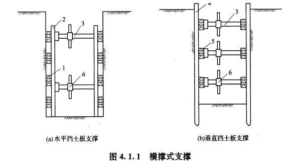 (1)橫撐式支撐。開挖較窄的溝槽,多用橫撐式土壁支撐。橫撐式土壁支撐根據(jù)擋土