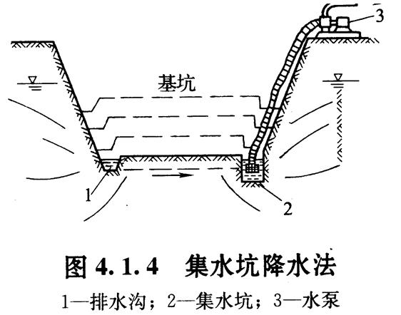 挖排水溝,使水流人集水坑,然后用水泵抽走(圖
