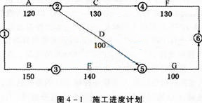 某施工單位與建設(shè)單位按《建設(shè)工程施工合同(示范文本)》簽訂了固定總價(jià)施工承包合同,合同工期390天,合同總價(jià)5 000萬元。合同中約定按建標(biāo)[2003]206號(hào)文綜合單價(jià)法計(jì) 價(jià)程序計(jì)價(jià),其中間接費(fèi)費(fèi)率為20%,規(guī)費(fèi)費(fèi)率為5%,取費(fèi)基數(shù)為人工費(fèi)與機(jī)械費(fèi)之和。施工前施工單位向工程師提交了施工組織設(shè)計(jì)和施工進(jìn)度計(jì)劃(單位:天),如圖4―1所示。