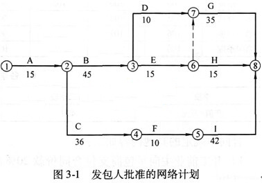 4)機(jī)械閑置補(bǔ)償費(fèi)為臺(tái)班單價(jià)的50%,人員窩工補(bǔ)償費(fèi)為50元/工日。開工前,承包人編制并經(jīng)發(fā)包人批準(zhǔn)的網(wǎng)絡(luò)計(jì)劃如圖3-1所示。