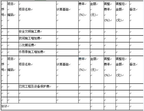 注:1.“計算基礎”中安全文明施工費可為“定額基價”、“定額人工費”或“定額人工費+定額機械費”,其他項目可為“定額人工費”或“定額人工費+定額機械費”。