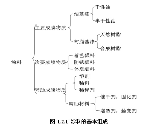 涂料的品種雖然很多,但就其組成而言,大體上可分為三部分,即主要成膜物質(zhì)、次要成膜物質(zhì)和輔助成膜物質(zhì)如圖1.2.1所示。
