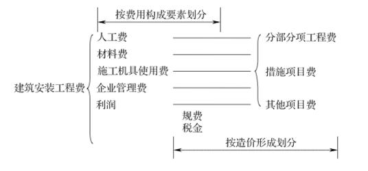 按造價形成劃分建筑安裝工程費(fèi)用項目構(gòu)成和計算;建筑安裝工程費(fèi)按照工程造價形成由分部分項工程費(fèi)、措施項目費(fèi)、其他項目費(fèi)、規(guī)費(fèi)和稅金組成。