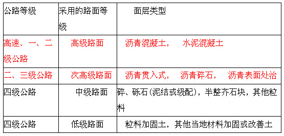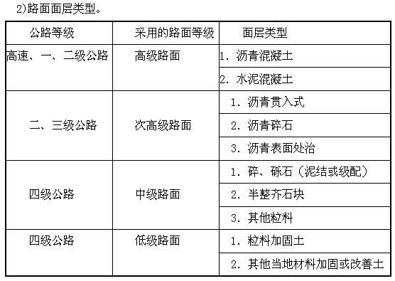 (1)路面等級。路面等級按面層材料的組成、結(jié)構(gòu)強度、路面所能承擔的交通任務和使用的品質(zhì)劃分為高級路面、次高級路面、中級路面和低級路面等四個等級。