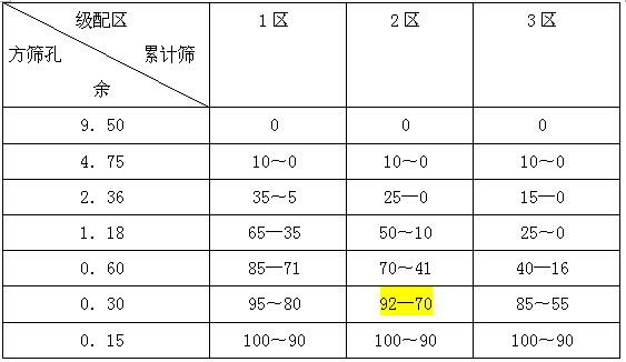 砂的顆粒級(jí)配用級(jí)配區(qū)表示,根據(jù)《建筑用砂》GB/T 14684的規(guī)定,對(duì)細(xì)度模數(shù)為3.7~1.6的砂,按累計(jì)篩余百分率劃分為三個(gè)級(jí)配區(qū),見表3.5.40混凝土用砂的顆粒級(jí)配應(yīng)處于表3.5.4中的任何一個(gè)級(jí)配區(qū)內(nèi),表中所列的累計(jì)篩余百分率,除4.75mm和0.60mm篩號(hào)外,允許稍有超出分界線,其總量不大于5%。