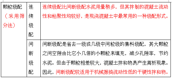 1) 連續(xù)級(jí)配:拌制的混凝土流動(dòng)性和粘聚性均較好,是現(xiàn)澆混凝土中最常用的
