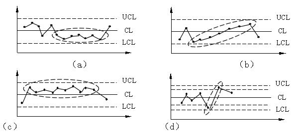 (2)分析控制圖。當(dāng)控制圖中的點(diǎn)子滿足以下兩個條件時:一是點(diǎn)子沒有跳出控制界限;二是點(diǎn)子隨機(jī)排列且沒有缺陷,即可認(rèn)為生產(chǎn)過程基本上處于控制狀態(tài),即生產(chǎn)正常。否則,就認(rèn)為生產(chǎn)過程發(fā)生了異常變化。這里所說的點(diǎn)子在控制界限內(nèi)排列有缺陷,包括以下幾種情況: