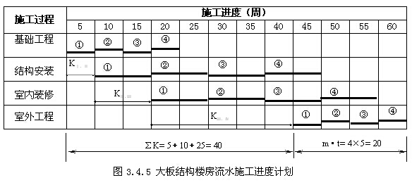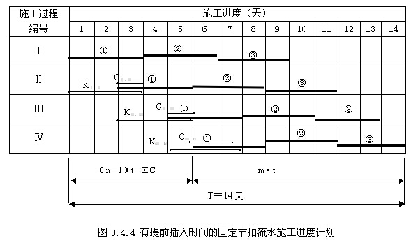 (4)確定流水施工工期。由圖4.4.6可知,本計劃中沒有組織間歇、工藝間歇及提前插入,故根據(jù)公式(4.4.6)算得流水施工工期為: