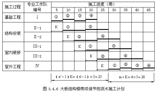 ③專業(yè)工作隊數(shù)大于施工過程數(shù),即有的施工過程只成立一個專業(yè)工作隊,而對于流水節(jié)拍大的施工過程,可按其倍數(shù)增加相應(yīng)專業(yè)工作隊數(shù)目;