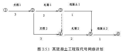 (1)工藝關系。生產(chǎn)性工作之間由工藝過程決定的、非生產(chǎn)性工作之間由工作程序決定的先后順序關系稱為工藝關系。在圖3.5.1所示的雙代號網(wǎng)絡計劃中,支模1→扎筋1→混凝土1為工藝關系。