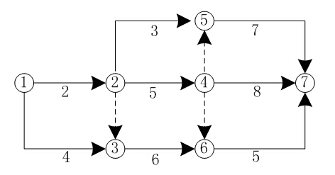注意:網(wǎng)絡圖中的節(jié)點都必須有編號,其編號嚴禁重復,并應使每一條箭線上箭尾節(jié)點編號小于箭頭節(jié)點編號。在雙代號網(wǎng)絡圖中,有時存在虛箭線,虛箭線不代表實際工作,我們稱之為虛工作。虛工作既不消耗時間,也不消耗資源。虛工作主要用來表示相鄰兩項工作之間的邏輯關系。但有時為了避免兩項同時開始、同時進行的工作具有相同的開始節(jié)點和完成節(jié)點,也需要用虛工作加以區(qū)分。