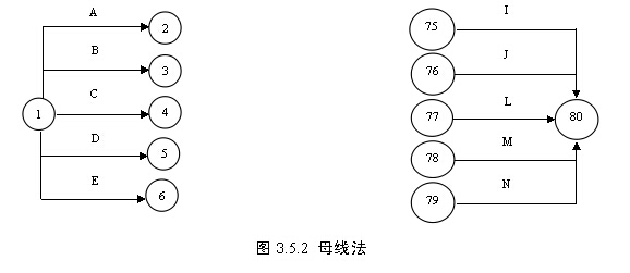 6)嚴禁在箭線上引入或引出箭線。但當網(wǎng)絡圖的起點節(jié)點有多條箭線引出(外向箭線)或終點節(jié)點有多條箭線引入(內向箭線)時,為使圖形簡潔,可用母線法繪圖。即:將多條箭線經(jīng)一條共用的垂直線段從起點節(jié)點引出,或將多條箭線經(jīng)一條共用的垂直線段引入終點節(jié)點,如圖3.5.2所示。對于特殊線型的箭線,如粗箭線、雙箭線、虛箭線、彩色箭線等,可在從母線上引出的支線上標出。