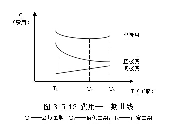 (1)工程費用與工期的關(guān)系。工程總費用由直接費和間接費組成。直接費會隨著工期的縮短而增加。間接費包括企業(yè)經(jīng)營管理的全部費用,它一般會隨著工期的縮短而減少。在考慮工程總費用時,還應(yīng)考慮工期變化帶來的其他損益,包括效益增量和資金的時間價值等。工程費用與工期的關(guān)系如圖3.5.13所示。