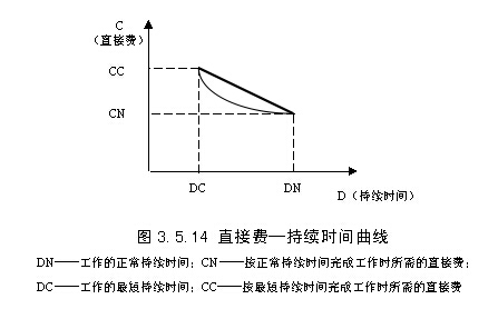 工作的直接費與持續(xù)時間之間的關(guān)系類似于工程直接費與工期之間的關(guān)系,工作的直接費隨著持續(xù)時間的縮短而增加,如圖3.5.14所示。