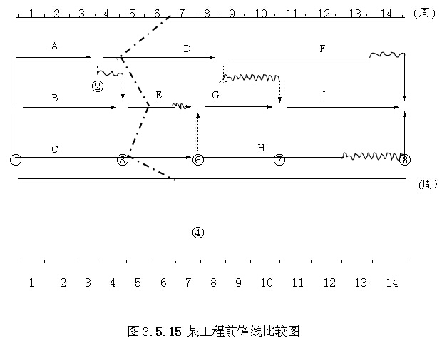 【解】根據(jù)第6周末實際進度的檢查結(jié)果繪制前鋒線,如圖3.5.15中點劃線所示。通過比較可以看出: