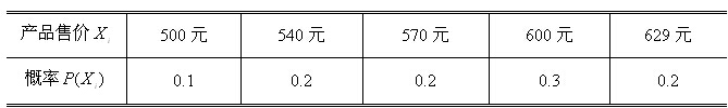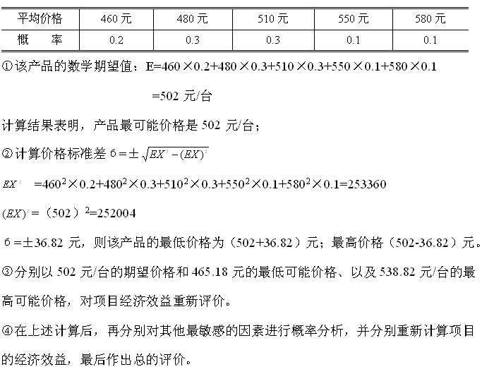 在項(xiàng)目原經(jīng)濟(jì)效益測(cè)算中,該產(chǎn)品的加權(quán)平均價(jià)格為500元/臺(tái),現(xiàn)經(jīng)老師預(yù)測(cè),該產(chǎn)品的平均價(jià)格及概率分布見(jiàn)下表,試對(duì)該產(chǎn)品作出概率分析,并重新計(jì)算項(xiàng)目的經(jīng)濟(jì)效益。