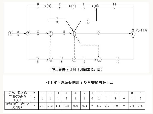 【背景】某市政工程,項(xiàng)目的合同工期為38周。經(jīng)總監(jiān)理工程師批準(zhǔn)的施工總進(jìn)度計(jì)劃如圖所示,香工作可以縮短的時(shí)間及其增加的趕工費(fèi)和表所示,其中H、L分別為道路的路基、路面工程。