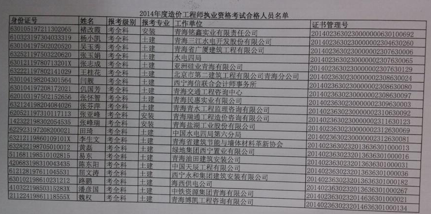 青海2014年造價(jià)工程師考試合格人員名單