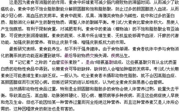 關(guān)于膳食的葷素在國(guó)內(nèi)外長(zhǎng)期以來(lái)爭(zhēng)論很多,近年來(lái),國(guó)內(nèi)外隨著“富裕病”的逐漸增多,人們對(duì)素食越來(lái)越感興趣,刮起了一股提倡吃素食的“新素食主義”風(fēng)潮。其主要依據(jù)是人類的生理構(gòu)造,在消化系統(tǒng)和其他生理構(gòu)造方面,與吃蔬菜動(dòng)物或食草動(dòng)物非常相象,卻與肉食動(dòng)力差別很大;人類沒有尖銳突出的犬牙,只有平坦的日齒可以磨碎食物;人類消化腺分泌的消化液特別有利于對(duì)素食進(jìn)行消化;人類的胃酸與肉食動(dòng)物的胃酸相比,在數(shù)量、濃度、強(qiáng)度上只有肉食動(dòng)物的 1/20;人類腸道的長(zhǎng)度是身長(zhǎng)的12倍,比肉食動(dòng)物的腸道長(zhǎng)2倍以上。根據(jù)這些報(bào)告,似乎可以得出結(jié)論,人類適合素食。