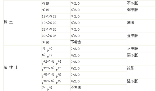 注:①表中碎石土僅指充填物為砂土或硬塑、堅硬狀態(tài)的粘性土,如充填物為其它狀態(tài)的粘性土或粉土?xí)r,其凍脹性應(yīng)按粘性土或粉土確定。