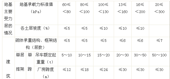 注:①地基主要受力層系指條形基礎(chǔ)底面下深度為3b(b為基礎(chǔ)底面寬度),獨(dú)立基礎(chǔ)下為1.5b,厚度均不小于5m的范圍(二層以下的民用建筑于除外)。
