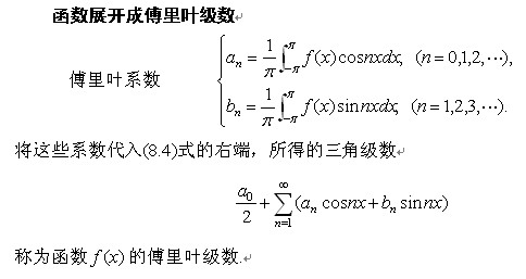 狄利克雷收斂定理告訴我們:只要函數(shù) 在區(qū)間 上至多只有有限個(gè)的第一類(lèi)間斷點(diǎn),并且不作無(wú)限次振動(dòng),則函數(shù) 的傅里葉級(jí)數(shù)在函數(shù)的連續(xù)點(diǎn)處收斂于到該點(diǎn)的函數(shù)值,在函數(shù)的間斷點(diǎn)處收斂于該點(diǎn)處的函數(shù)的左極限與右極限的算術(shù)平均值. 由此可見(jiàn),函數(shù)展開(kāi)成傅里葉級(jí)數(shù)的條件要比函數(shù)展開(kāi)成冪級(jí)數(shù)的條件低得多.
