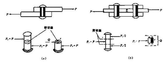 當(dāng)作為連接件的鉚釘、螺栓、銷釘、鍵等承受一對大小相等、方向相反、作用線互相平行且相距很近的力作用時(shí),當(dāng)外力過大;其主要破壞形式之一是沿剪切面發(fā)生剪切破壞,如圖2-1所示的鉚釘連接中的鉚釘。因此必須考慮其剪切強(qiáng)度問題。