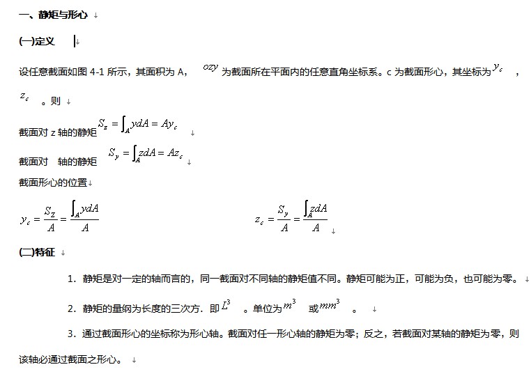 本節(jié)主要了解靜矩和形心、極慣性矩和慣性積的概念,熟悉簡單圖形靜矩、形心、慣性矩和慣性積的計(jì)算,掌握其計(jì)算公式。掌握慣性矩和慣性積平行移軸公式的應(yīng)用,熟練掌握有一對稱軸的組合截面慣性矩的計(jì)算方法。準(zhǔn)確理解形心主軸和形心主慣性矩的概念,熟悉常見組合截面形心主慣性矩的計(jì)算步驟。