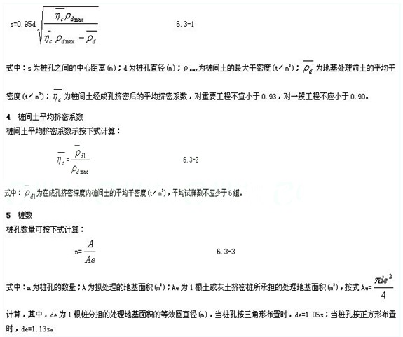 樁孔直徑宜為300~450mm,并可根據(jù)所選用的成孔設(shè)備或成孔方法確定。為使樁間土均勻擠密,樁孔宜按等邊三角形布置,樁孔之間的中心距離s,可為樁孔直徑的2.0~2.5倍,也可按下式估算: