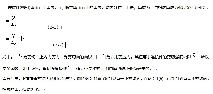 當(dāng)作為連接件的鉚釘、螺栓、銷釘、鍵等承受一對(duì)大小相等、方向相反、作用線互相平行且相距很近的力作用時(shí),當(dāng)外力過大;其主要破壞形式之一是沿剪切面發(fā)生剪切破壞,如圖2-1所示的鉚釘連接中的鉚釘。因此必須考慮其剪切強(qiáng)度問題。