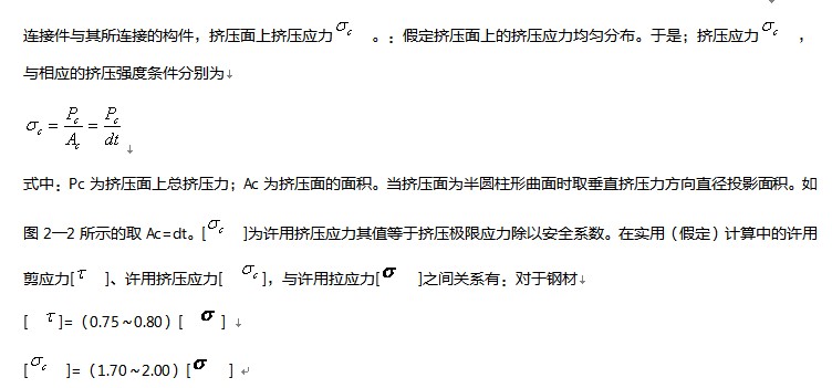 在承載的同時,連接件與其所連接的構(gòu)件在相互直接接觸面上發(fā)生擠壓,因而產(chǎn)生的應(yīng)力稱為擠壓應(yīng)力。當擠壓應(yīng)力過大時,將導致兩者接觸面的局部區(qū)域產(chǎn)生顯著塑性變形,因而影響它們的正常配合工作,連接松動。為此必須考慮它們的擠壓強度問題。如圖2―2所示的鉚釘連接中的鉚釘與鋼板間的擠壓。