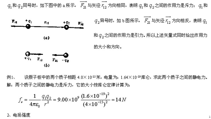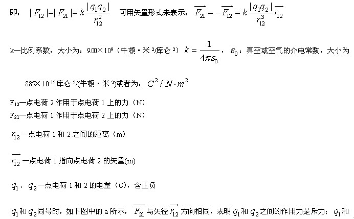 庫侖定律: 在真空中兩個(gè)靜止點(diǎn)電荷間的相互作用力,方向沿兩個(gè)點(diǎn)電荷的連線,同種電荷相斥,異種電荷相吸;大小正比于兩點(diǎn)電荷電量大小的乘積,反比于兩點(diǎn)電荷間距離的平方。