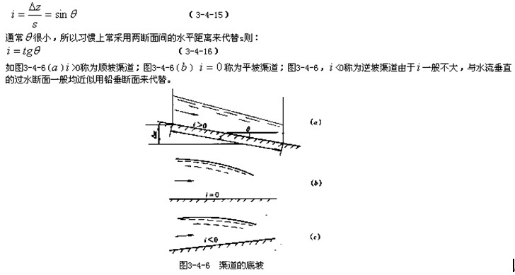 明渠水流在渠道中流動(dòng),受到渠道橫斷面和渠道底坡的制約。渠道橫斷面的形狀、尺寸沿程不變的稱(chēng)為棱柱形渠道,棱柱形渠道中水流的過(guò)水?dāng)嗝娴拇笮≈浑S水深變化。橫斷面的形狀或尺寸沿程有改變的則稱(chēng)為非棱柱形渠道。渠道底部高程沿水流方向的變化用底坡表示。如圖3-4-6( )所示: