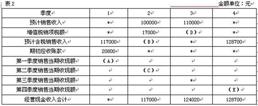 乙投資者每份認(rèn)股權(quán)證的購(gòu)買價(jià)格=發(fā)行時(shí)每份認(rèn)股權(quán)證的理論價(jià)值=5(元) 乙投資者認(rèn)購(gòu)認(rèn)股權(quán)的份數(shù)=15000/5=3000(份) 股票市價(jià)為18元時(shí), 乙投資者每份認(rèn)股權(quán)證的出售價(jià)格=出售時(shí)每份認(rèn)股權(quán)證的理論價(jià)值 =(18-10)×1=8(元) 所以, 乙投資者認(rèn)股權(quán)證投資的收益率=【(8-5)*3000】/15000×100%=60% 2.B公司為一上市公司,適用的企業(yè)所得稅稅率為25%,相關(guān)資料如下: 資料一:2008年12月31日發(fā)行在外的普通股為10000萬股(每股面值1元),公司債券為24000萬元(該債券發(fā)行于2006年年初,期限5年,每年年末付息一次,利息率為5%),該年息稅前利潤(rùn)為5000萬元。假定全年沒有發(fā)生其他應(yīng)付息債務(wù)。 資料二:B公司打算在2009年為一個(gè)新投資項(xiàng)目籌資10000萬元,該項(xiàng)目當(dāng)年建成并投產(chǎn)。預(yù)計(jì)該項(xiàng)目投產(chǎn)后公司每年息稅前利潤(rùn)會(huì)增加1000萬元?,F(xiàn)有甲乙兩個(gè)方案可供選擇,其中:甲方案為增發(fā)利息率為6%的公司債券;乙方案為增發(fā)2000萬股普通股。假定各方案的籌資費(fèi)用均為零,且均在2009年1月1日發(fā)行完畢。部分預(yù)測(cè)數(shù)據(jù)如表1所示: 說明:上表中“*”表示省略的數(shù)據(jù)。 要求: (1)根據(jù)資料一計(jì)算B公司2009年的財(cái)務(wù)杠桿系數(shù)。 (2)確定表1中用字母表示的數(shù)值(不需要列示計(jì)算過程)。 (3)計(jì)算甲乙兩個(gè)方案的每股收益無差別點(diǎn)息稅前利潤(rùn)。 (4)用EBIT―EPS分析法判斷應(yīng)采取哪個(gè)方案,并說明理由。 參考答案: (1)2008年利息費(fèi)用=24000*5%=1200萬元 2009年的財(cái)務(wù)杠桿系數(shù) =2008年的息稅前利潤(rùn)/(2008年的息稅前利潤(rùn)-2008年的利息費(fèi)用) =5000/(5000-1200) =1.32 (2)A=1800,B=0.30 【解析】 A=增資后的利息=增資前的利息+增加的利息 =1200+10000*6% =1800萬元 B=乙增資后每股收益=增資后稅后利潤(rùn)/增資后普通股股數(shù) =3600/(10000+2000)=0.3 (3)設(shè)甲乙兩個(gè)方案的每股收益無差別點(diǎn)息稅前利潤(rùn)為W萬元,則: 每股收益無差別點(diǎn)息稅前利潤(rùn)= =4800(萬元) (4)預(yù)計(jì)項(xiàng)目投產(chǎn)后公司每年息稅前利潤(rùn)為6000萬元(5000+1000)大于無差別點(diǎn)息稅前利潤(rùn),所以,該企業(yè)應(yīng)該采取發(fā)行債券的籌資方案,這種籌資方案的每股收益會(huì)高于普通股籌資的每股收益。 3.C公司為一般納稅人,購(gòu)銷業(yè)務(wù)適用的增值稅稅率為17%,只生產(chǎn)一種產(chǎn)品。相關(guān)預(yù)算資料如下: 資料一:預(yù)計(jì)每個(gè)季度實(shí)現(xiàn)的銷售收入(含增值稅)均以賒銷方式售出,其中60%在本季度內(nèi)收到現(xiàn)金,其余40%要到下一季度收訖,假定不考慮壞賬因素。部分與銷售預(yù)算有關(guān)的數(shù)據(jù)如表2所示: 說明:上表中“*”表示省略的數(shù)據(jù)。 資料二:預(yù)計(jì)每個(gè)季度所需要的直接材料(含增值稅)均以賒購(gòu)方式采購(gòu),其中50%于本季度內(nèi)支付現(xiàn)金,其余50%需要到下個(gè)季度付訖,假定不存在應(yīng)付賬款到期現(xiàn)金支付能力不足的問題。部分與直接材料采購(gòu)預(yù)算有關(guān)的數(shù)據(jù)如表3所示: 說明:上表中“*”表示省略的數(shù)據(jù)。 要求: (1)根據(jù)資料一確定表2中用字母表示的數(shù)值(不需要列示計(jì)算過程)。 (2)根據(jù)資料二確定表3中用字母表示的數(shù)值(不需要列示計(jì)算過程)。 (3)根據(jù)資料一和資料二,計(jì)算預(yù)算年度應(yīng)收賬款和應(yīng)付賬款的年末余額。 參考答案: (1)A=70200(元),B=117000(元),C=70200(元),D=18700(元),E=77220(元) 【解析】 A=第一季度銷售當(dāng)期收現(xiàn)額=117000*60%=70200(元) B=第二季度預(yù)計(jì)含稅銷售收入=100000+17000=117000(元) C=第二季度銷售當(dāng)期收現(xiàn)收入=117000*60%=70200(元) D=第三季度增值稅銷項(xiàng)稅額=110000*17%=18700(元) E=第四季度銷售當(dāng)期收現(xiàn)額=128700*60%=77220(元) (2)F=70200(元),G=10200(元),H=35100(元) 【解析】 F=預(yù)計(jì)含稅采購(gòu)金額=預(yù)計(jì)材料采購(gòu)成本+增值稅進(jìn)項(xiàng)稅額 =60000+60000*17%=70200(元) G=第二季度增值稅進(jìn)項(xiàng)稅額 =【預(yù)計(jì)含稅采購(gòu)金額/(1+17%)】*17% =【70200/(1+17%)】*17% =10200(元) H=第三季度期初應(yīng)付賬款=第二季度預(yù)計(jì)含稅采購(gòu)金額*賒購(gòu)率 =70200*50%=35100(元) (3)應(yīng)收賬款年末余額=128700×40%=51480(元) 應(yīng)付賬款年末余額=77220×50%=38610(元) 4.D公司為投資中心,下設(shè)甲乙兩個(gè)利潤(rùn)中心,相關(guān)財(cái)務(wù)資料如下: 資料一:甲利潤(rùn)中心營(yíng)業(yè)收入為38000元,變動(dòng)成本總額為14000元,利潤(rùn)中心負(fù)責(zé)人可控的固定成本為4000元,利潤(rùn)中心負(fù)責(zé)人不可控但應(yīng)由該中心負(fù)擔(dān)的固定成本為7000元。 資料二:乙利潤(rùn)中心負(fù)責(zé)人可控利潤(rùn)總額為30000元,利潤(rùn)中心可控利潤(rùn)總額為22000元。 資料三:D公司利潤(rùn)為33000元,投資額為200000元,該公司預(yù)期的最低投資報(bào)酬率為12%。 要求: (1)根據(jù)資料一計(jì)算甲利潤(rùn)中心的下列指標(biāo): ?、倮麧?rùn)中心邊際貢獻(xiàn)總