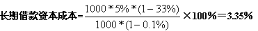 某公司欲從銀行借款1000萬(wàn)元,手續(xù)費(fèi)率0.1%,年利率5%,期限3年,每年結(jié)息一次,到期還本,公司所得稅稅率為33%。則該筆長(zhǎng)期借款籌資成本為: