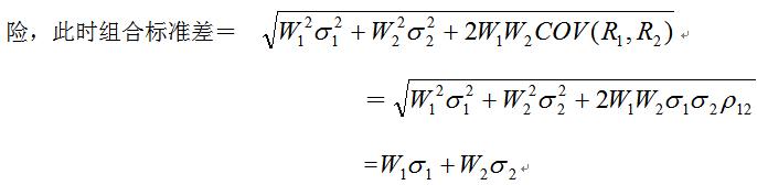 當(dāng)相關(guān)系數(shù)為1 時(shí),組合標(biāo)準(zhǔn)離差=(12%+8%)/2=10%;在等比例投資的情況下,相關(guān)系數(shù)為-1時(shí),組合標(biāo)準(zhǔn)離差=(12%-8%)/2=2%。