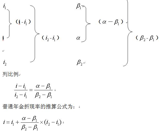 若所求的折現(xiàn)率為i,對應(yīng)的年金現(xiàn)值系數(shù)為α;i1、i2分別為與i相鄰的兩個折現(xiàn)率,且i1