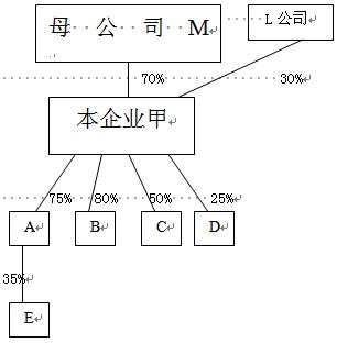 【補充例】假設(shè)本企業(yè)為甲公司,其投資與被投資情況(如下圖):甲企業(yè)的母公司為M公司,所占股權(quán)比例為70%,另一投資者L公司所占股權(quán)比例為30%;甲企業(yè)直接投資A、B、C、D四家公司,股權(quán)比例分別為75%、80%、50%、25%;A公司投資E公司,所占股權(quán)比例為35%。