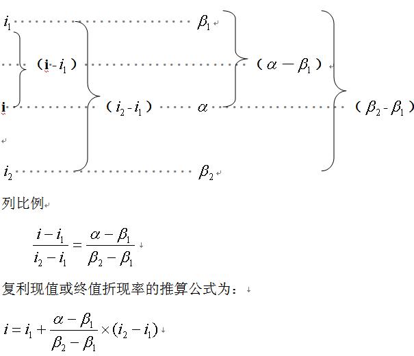 若所求的折現(xiàn)率為i,對應(yīng)的復(fù)利現(xiàn)值或終值系數(shù)為α;i1、i2分別為與i相鄰的兩個折現(xiàn)率,且i1