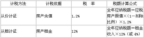 (1)從價(jià)計(jì)征。從價(jià)計(jì)征的房產(chǎn)稅,是以房產(chǎn)余值為計(jì)稅依據(jù)。房產(chǎn)稅依據(jù)房產(chǎn)原值一次減除10%~30%后的余值計(jì)算繳納。房產(chǎn)稅采用比例稅率,依照房產(chǎn)余值從價(jià)計(jì)征的,稅率為1.2%。